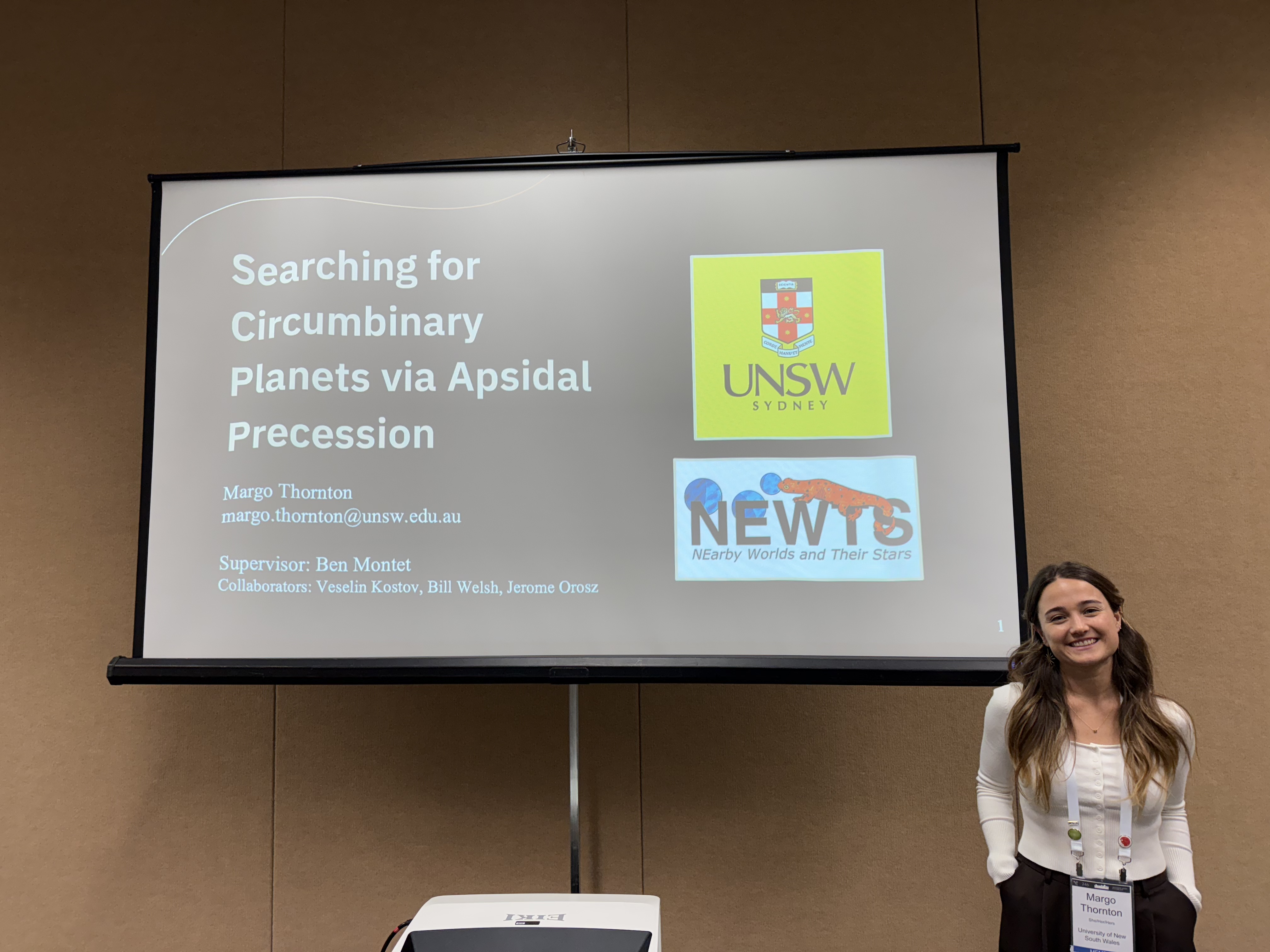 Hi! My name is Margo Thornton, and I am a Ph.D. candidate at the University of New South Wales (UNSW) in Sydney, Australia, where I work with Ben Montet as a part of the NEarby World and Their Stars (NEWTS) group on the detection of circumbinary planets (exoplanets orbiting binary stars). Before starting my Ph.D., I earned a M.S. in Astronomy at San Diego State University (SDSU) and a B.S. in Physics at California Polytechnic State University, San Luis Obispo, with minors in Astronomy and Mathematics.